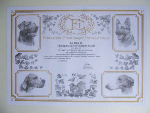 22.November 2014 CH. New Dawn vom Rosendahl ![]() 28.08.2014 "Internationaler Schönheits-Champion" 25.09.2012 "Deutscher- Champion KLUB DNK" 27.09.2011 "Deutscher- Champion VDH" 07.05.2011 "FCI- Jahrhundertsieger" 02.09.2010 "Deutscher Jugend-Champion VDH" 06.05.2010 "Deutscher Jugend-Champion DNK" |